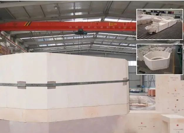 其產(chǎn)品優(yōu)點(diǎn)為:①使用了電熔氧化硅結(jié)合相,不含氧化鈣成分,二氧化硅含量可達(dá)98.5%以上;②密度更小(1.8g/cm3),降低了整個(gè)大碹的重量;③價(jià)格相比同級(jí)別電熔材料更低;④比硅磚具有更低的膨脹系數(shù)(650℃時(shí)0.6%)、更高的使用溫度(T0.5為1690℃);⑤更好的體積穩(wěn)定性。在國內(nèi)某全氧燃燒窯爐上有使用經(jīng)歷,但大碹出現(xiàn)威脅到窯爐的變形問題。