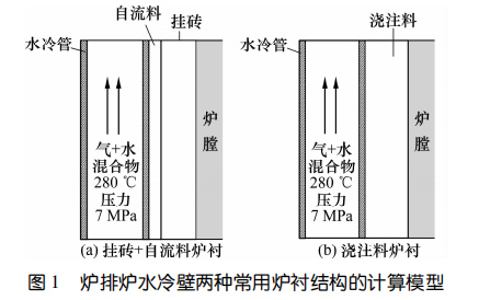國(guó)內(nèi)外爐排爐在水冷壁內(nèi)襯結(jié)構(gòu)設(shè)計(jì)上有較大差別,國(guó)外爐排爐水冷壁內(nèi)襯結(jié)構(gòu)為鰭片(扁鋼)掛釘+SiC掛磚+SiC自流料填充密封,簡(jiǎn)稱膜式壁結(jié)構(gòu);國(guó)內(nèi)則為水冷管錨固釘+SiC澆注料結(jié)構(gòu)。不同的爐襯材質(zhì)和結(jié)構(gòu)對(duì)水冷壁內(nèi)襯傳熱有較大影響,目前尚未見(jiàn)爐排爐水冷壁內(nèi)襯熱傳導(dǎo)研究報(bào)道。