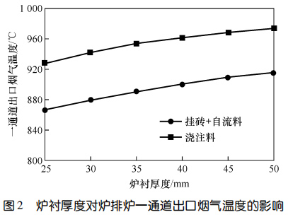 2、對(duì)于掛磚+自流料爐襯,掛磚厚度不變時(shí),自流料厚度越大,一通道出口煙氣溫度越高;爐襯總厚度不變時(shí),掛磚越厚、自流料層越薄,一通道出口煙氣溫度越低;爐襯各工作層厚度固定時(shí),一通道出口煙氣溫度隨自流料熱導(dǎo)率的升高而降低,通過(guò)調(diào)整自流料熱導(dǎo)率,一通道出口煙溫差值可達(dá) 70 ℃。