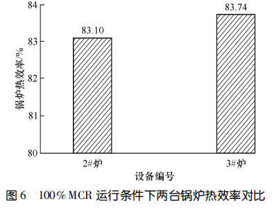 兩臺(tái)設(shè)備運(yùn)行 11 個(gè)月后進(jìn)行了能效測(cè)試。圖5對(duì)比了 90%鍋爐大的連續(xù)蒸發(fā)量(簡(jiǎn)稱 MCR)和MCR 條件下鍋爐一通道的出口煙溫。圖6示出了MCR運(yùn)行條件下兩臺(tái)鍋爐熱效率的對(duì)比。結(jié)果顯示:在 90%MCR 運(yùn)行條件下,3#爐一通道出口煙溫比2#爐低 135.9 ℃,在MCR 運(yùn)行條件下,3#爐一通道出口煙溫比 2#爐低 149.7 ℃,3#爐的熱效率比 2#爐高 0.64%。相較而言,使用膜式壁爐襯的3#爐在負(fù)荷相當(dāng)?shù)那闆r下,余熱鍋爐熱效率更高。