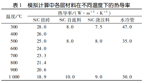 水冷壁內(nèi)襯的熱傳導(dǎo)性能需要與爐況相匹配,既要盡可能多地將熱量傳導(dǎo)出去發(fā)電,又要保證一通道出口溫度不低于 850℃。模擬計(jì)算設(shè)定耐火材料熱導(dǎo)率恒定,暫不考慮使用過(guò)程中耐火材料組成變化對(duì)熱導(dǎo)率的影響和爐襯表面積灰對(duì)爐襯熱傳導(dǎo)的影響也不考慮掛釘和錨固釘對(duì)熱傳導(dǎo)的影響。進(jìn)行模擬計(jì)算時(shí),水冷壁內(nèi)襯各工作層選取的熱導(dǎo)率見(jiàn)表1。