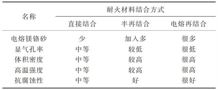 根據(jù)鎂鉻質(zhì)耐火材料的結(jié)合形式的不同,包括直接結(jié)合、半再結(jié)合、電熔再結(jié)合等鎂鉻質(zhì)耐火材料。其中,直接結(jié)合鎂鉻質(zhì)耐火材料是以高純燒結(jié)鎂砂和鉻鐵礦為原料,將電熔鎂砂與鉻礦直接燒結(jié);半再結(jié)合鎂鉻質(zhì)耐火材料是以電熔鎂鉻砂作屬粒,加入部分鉻礦和鎂砂或燒結(jié)合成鎂鉻料作細(xì)粉,高溫?zé)Y(jié)而成;電熔再結(jié)合鎂鉻質(zhì)耐火材料是將鉻礦與電熔鎂砂在電爐中電熔,制得電熔鎂鉻砂,再高溫?zé)Y(jié)而成。3類鎂鉻質(zhì)耐火磚材料特性對(duì)比,見(jiàn)表1。